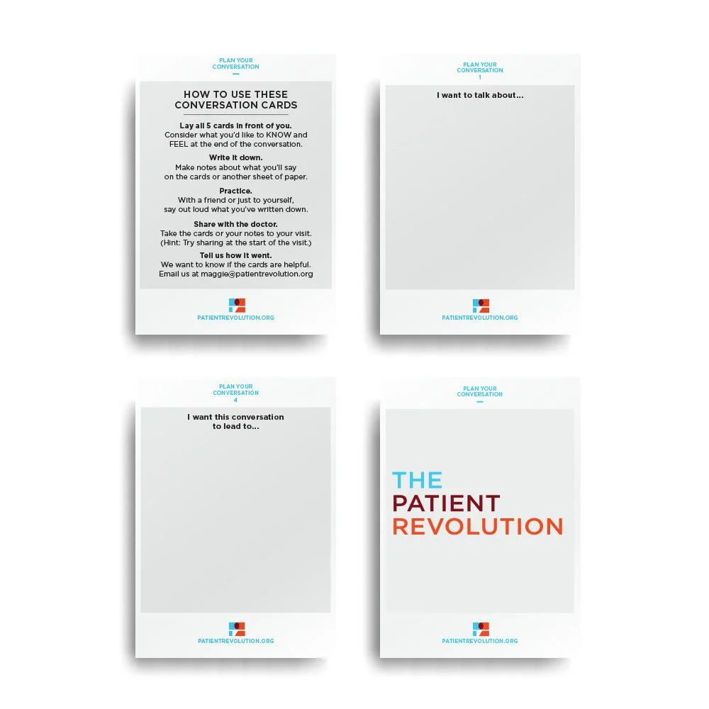 The Plan Your Conversation cards help patients think through what they’d like to share and “practice” a conversation they’d like to have with the clinician. The cards can be used for any condition or issue and in any care setting.